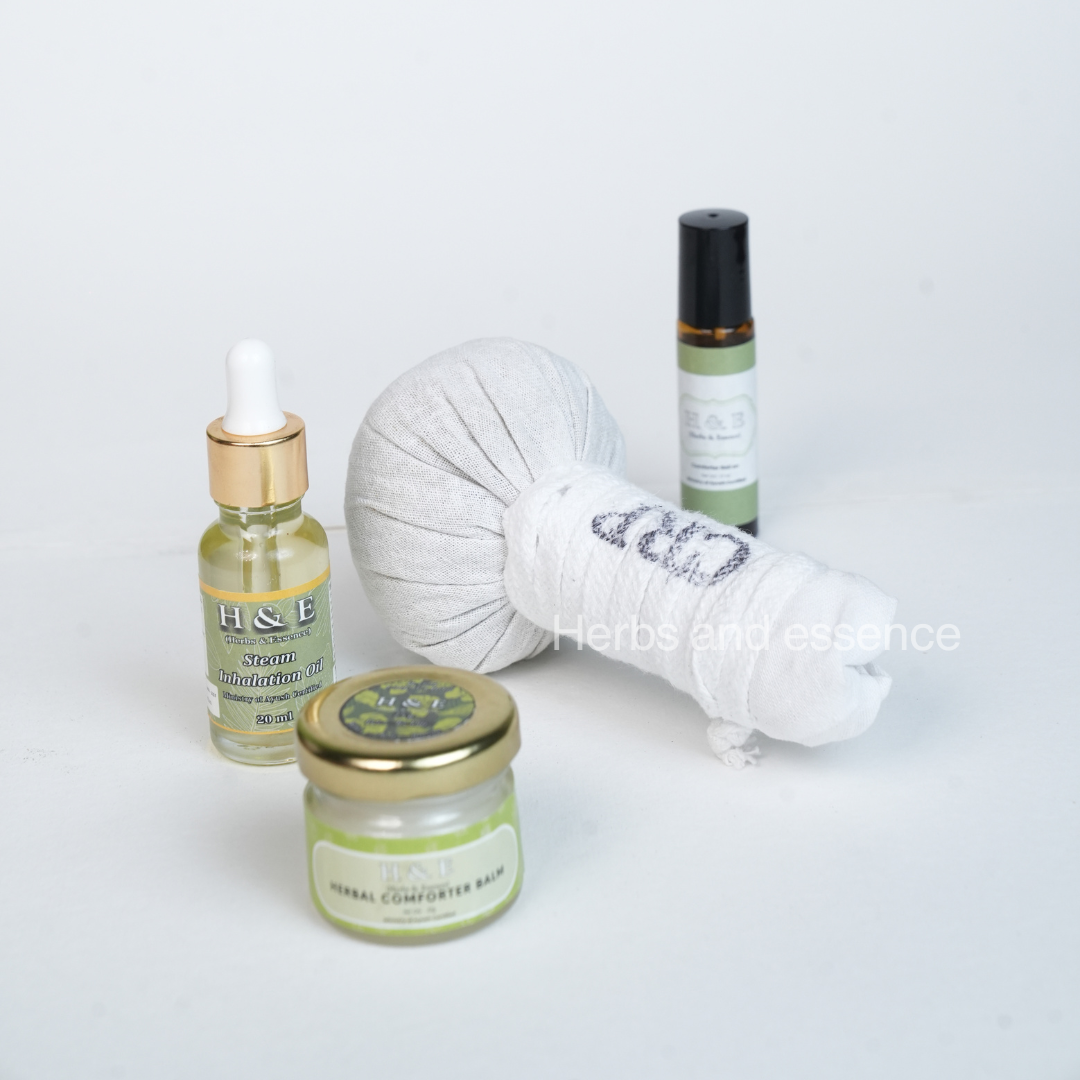 This combo contains: Cold Relief Potli, Comforter Balm, Comforter Roll on and Steam Inhalation oil.